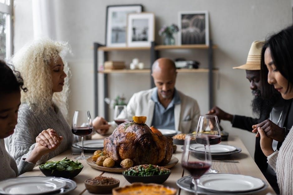 Presenting your Trader Joe’s Brined Turkey in an appealing way enhances the dining experience. Start by placing the turkey on a large‚ attractive platter or carving board. Garnish with fresh herbs like rosemary or thyme sprigs for a fragrant and visually appealing touch. Add sliced fresh fruit‚ such as oranges or apples‚ around the turkey for a pop of color and festive vibe. Arrange the sliced turkey neatly‚ ensuring even portions and a balanced layout. Drizzle pan juices over the turkey to add shine and highlight the flavors. Consider adding a few whole pieces‚ like drumsticks‚ for variety. Surround the turkey with side dishes like mashed potatoes‚ stuffing‚ or roasted vegetables to create a complete‚ inviting spread. This presentation makes the turkey the centerpiece of your meal and ensures a memorable experience for your guests.